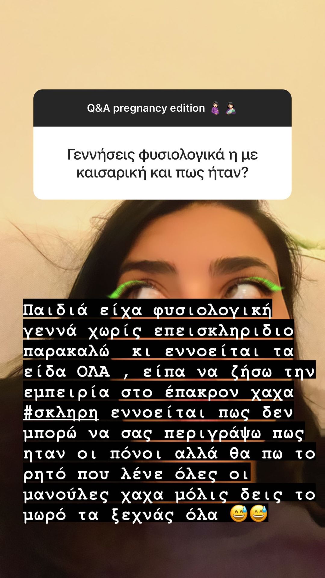 Η Μαρία Καζαριάν αποκάλυψε επίσης: «Παιδιά είχα φυσιολογική γέννα χωρίς επισκληρίδιο παρακαλώ και εννοείται τα είδα όλα, είπα να ζήσω την εμπειρία στο έπακρο χαχα σκληρή. Εννοείται πως δεν μπορώ να σας περιγράψω πως ήταν οι πόνοι αλλά θα πω το ρητό που λένε όλες οι μανούλες χαχα μόλις δεις το μωρό τα ξεχνάς όλα».