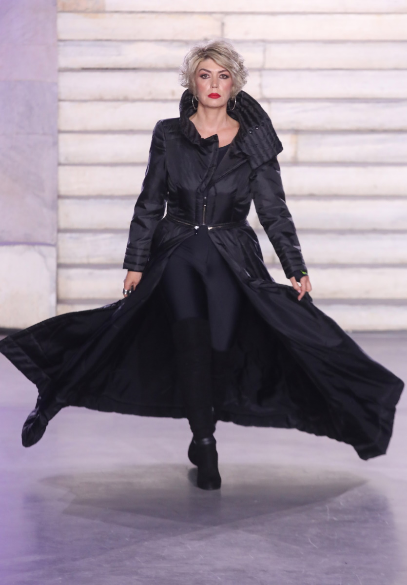 Η Μαρία Μάρκου ανέβηκε στην πασαρέλα φορώντας μία στενή, ολόσωμη μαύρη φόρμα και ένα μακρύ μαύρο μπουφάν με μεγάλο γιακά. Το λουκ της ολοκλήρωναν ψηλές μαύρες μπότες πάνω από το γόνατο.