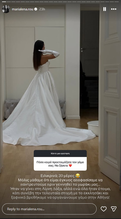 «Οργάνωσα τον γάμο μέσα σε 20 μέρες. Μόλις μάθαμε ότι είμαι έγκυος, αποφασίσαμε να παντρευτούμε πριν γεννηθεί το μωράκι μας. Ήταν να γίνει στη Λίμνη Δόξα, αλλά ενώ όλα ήταν έτοιμα, κάτι συνέβη την τελευταία στιγμή με το εκκλησάκι και ξαφνικά βρεθήκαμε να οργανώνουμε γάμο στην Αθήνα», ανέφερε η Μαριαλένα Ρουμελιώτη.