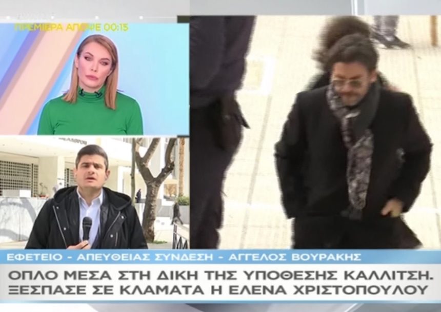 “Πρώτη στο βήμα για να καταθέσει ανέβηκε η κυρία Χριστοπούλου, η οποία περιέγραψε με πολύ δραματικούς τόνους όσα έζησε εκείνο το βράδυ. Αποκαλούσε αρχικά τον εν διαστάσει σύζυγό της “κύριο Καλλίτση”, στην πορεία όμως άλλαξε τη στάση της, έκλαιγε και είπε “ο Πάνος έκανε τα πάντα για να μας προστατεύσει εκείνο το βράδυ”. Στις επίμονες ερωτήσεις από τους συνηγόρους υπεράσπισης για το τι ακριβώς έγινε, η γυναίκα δεν άντεξε. Έτρεμε και έκλαιγε. Τότε, ένας από τους συνηγόρους υπεράσπισης έβγαλε ένα όπλο από τον χαρτοφύλακά του. Της ζήτησε να κάνουν μια αναπαράσταση. Στη θέα του όπλου η κυρία Χριστοπούλου ξέσπασε σε λυγμούς και επενέβη η πρόεδρος του δικαστηρίου. Του είπε να το βάλει μέσα και τον ρώτησε αν είναι αληθινό. Εκείνος της απάντησε με ειρωνικό ύφος πώς είναι ψεύτικο και κάνει 0.99 ευρώ . Ο Πάνος Καλλίτσης επενέβη τότε και φώναξε: “ντροπή σας”. Το όπλο το έβγαλε ο συνήγορος του Έλληνα κατηγορούμενου…”, είπε χαρακτηριστικά ο δημοσιογράφος Άγγελος Βουράκης στην εκπομπή “Μαζί σου” της Τατιάνας Στεφανίδου στον ΣΚΑΪ.