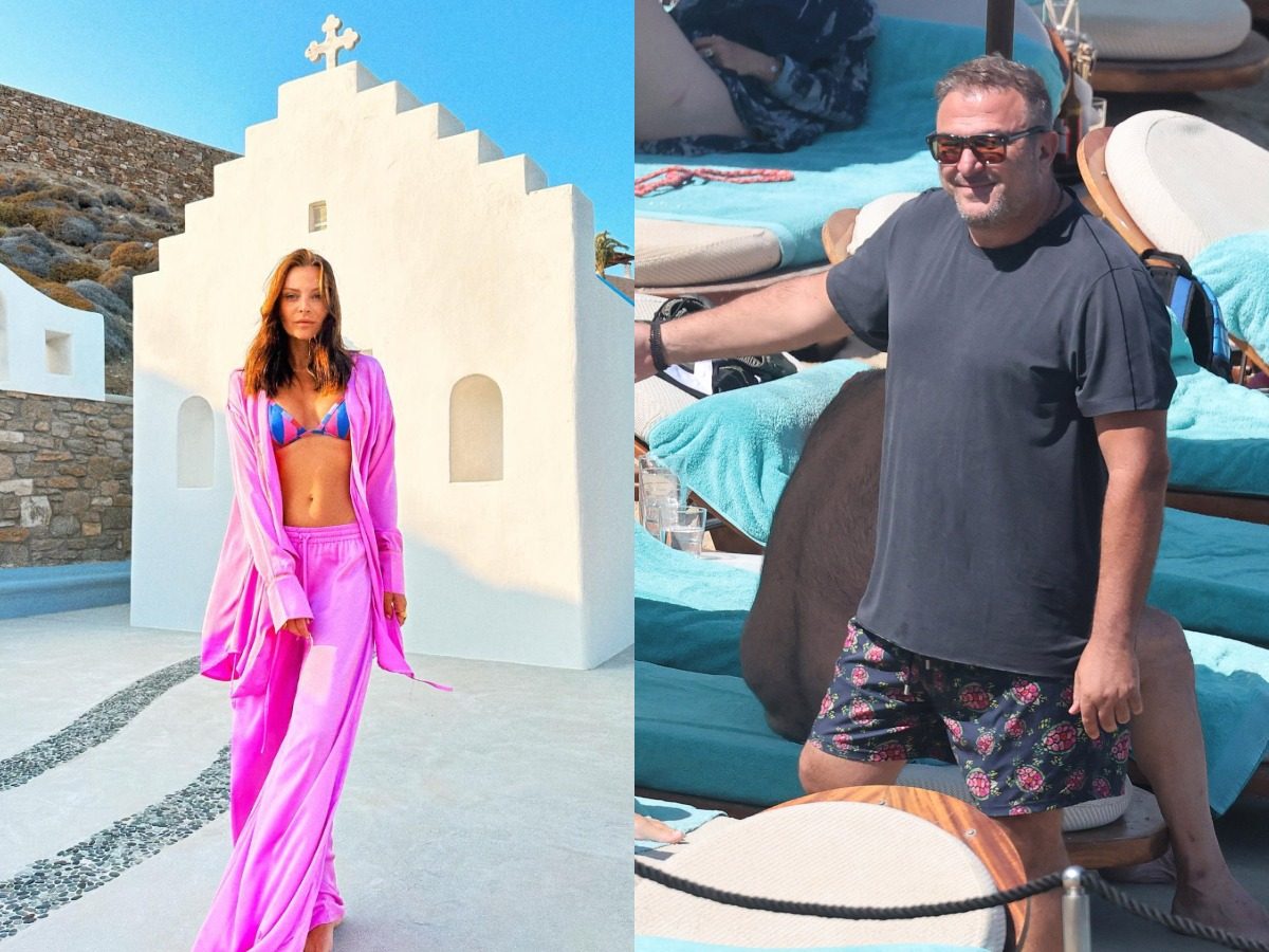 Η σύζυγος του τραγουδιστή Υβόννη Μπόσνιακ, το περασμένο καλοκαίρι, πόζαρε μπροστά από το επίμαχο εκκλησάκι, έξω από τη βίλα τους στη Μύκονο (βλέπε εξωτερική φωτογραφία)
