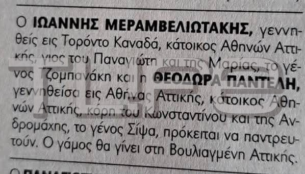 Το TLIFE εξασφάλισε και την αναγγελία γάμου του ζευγαριού στην οποία αναφέρεται: «Ο Ιωάννης Μεραμβελιωτάκης, γεννηθείς εις Τορόντο Καναδά, κάτοικος Αθηνών Αττικής, γιος του Παναγιώτη και της Μαρίας, το γένος Τζομπανάκη και η Θεοδώρα Παντέλη, γεννηθείσα εις Αθήνας Αττικής, κάτοικος Αθηνών Αττικής, κόρη του Κωνσταντίνου και της Ανδρομάχης, το γένος Σίψα, πρόκειται να παντρευτούν. Ο γάμος θα γίνει στη Βουλιαγμένη Αττικής».
