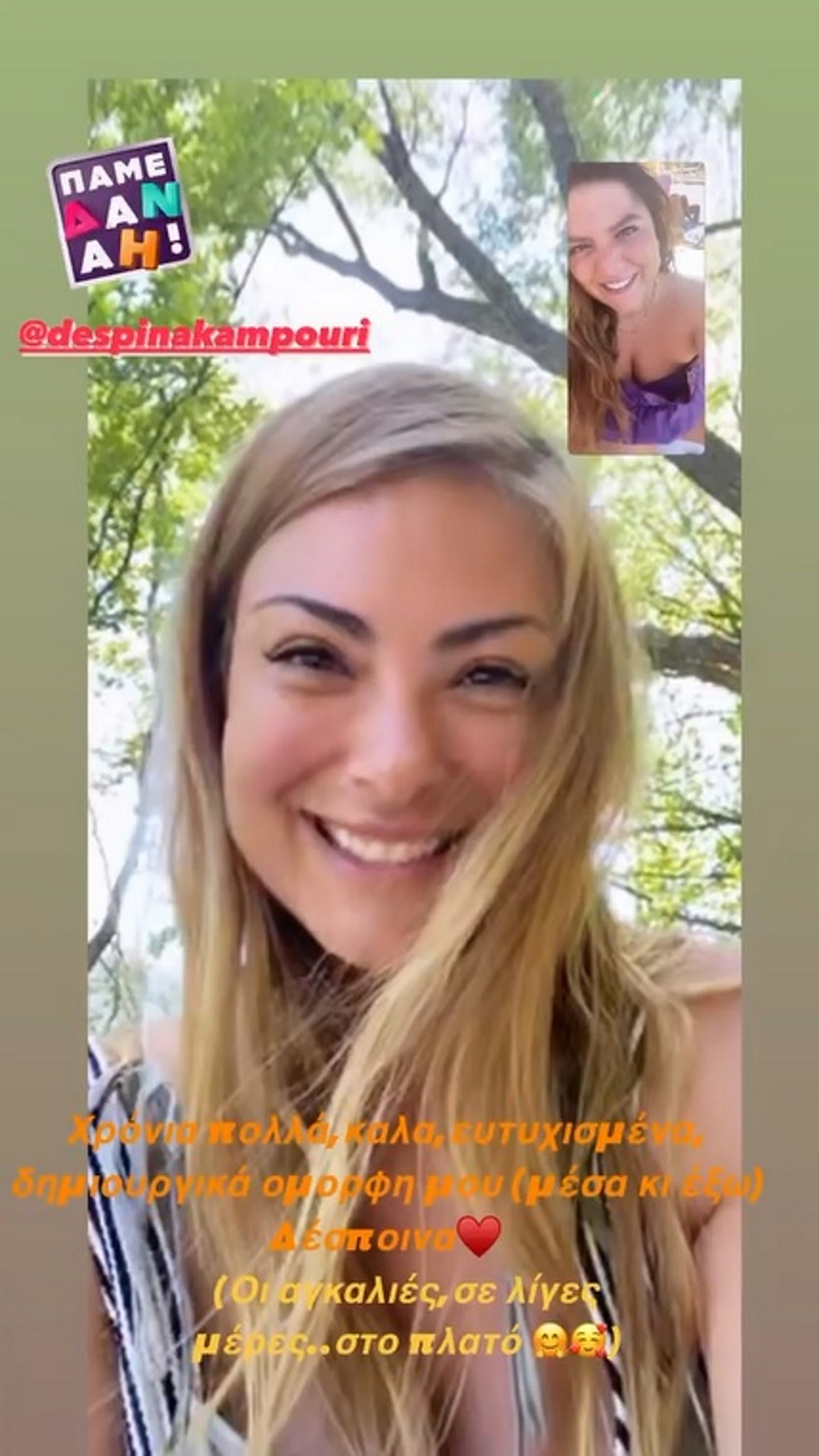 Η Δανάη Μπάρκα ανέβασε ένα στιγμιότυπο βιντεοκλήσης με τη δημοσιογράφο, με αφορμή τη γιορτή της, ανήμερα του Δεκαπενταύγουστου. «Χρόνια πολλά, καλά, ευτυχισμένα, δημιουργικά όμορφή μου (μέσα κι έξω) Δέσποινα. Οι αγκαλιές σε λίγες μέρες στο πλατό», έγραψε χαρακτηριστικά.