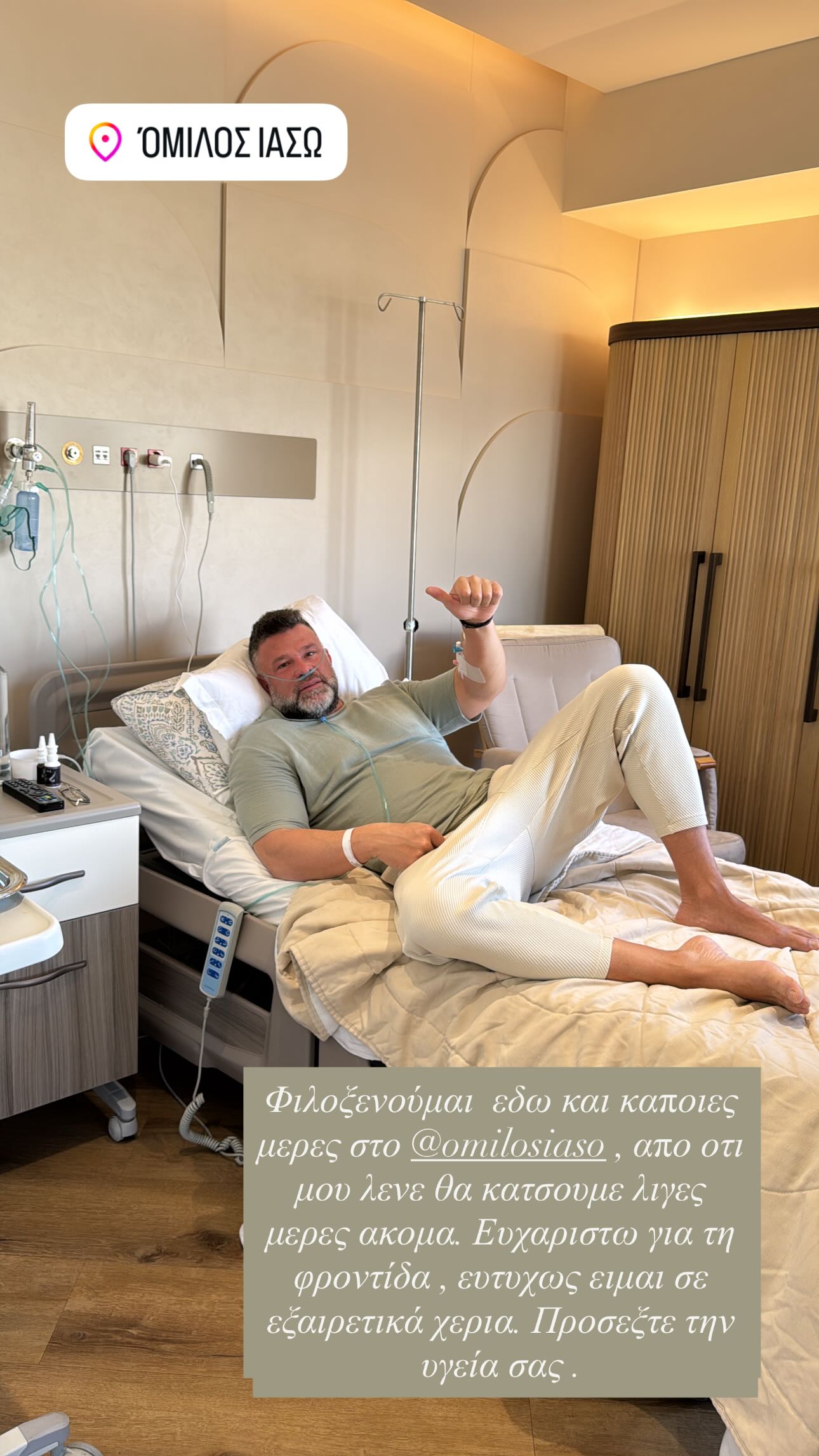 «Φιλοξενούμαι εδώ και κάποιες μέρες στο νοσοκομείο, από ό,τι μου λένε θα κάτσουμε λίγες μέρες ακόμα. Ευχαριστώ για τη φροντίδα, ευτυχώς είμαι σε εξαιρετικά χέρια. Προσέξτε την υγεία σας» έγραψε ο Κώστας Σόμμερ.