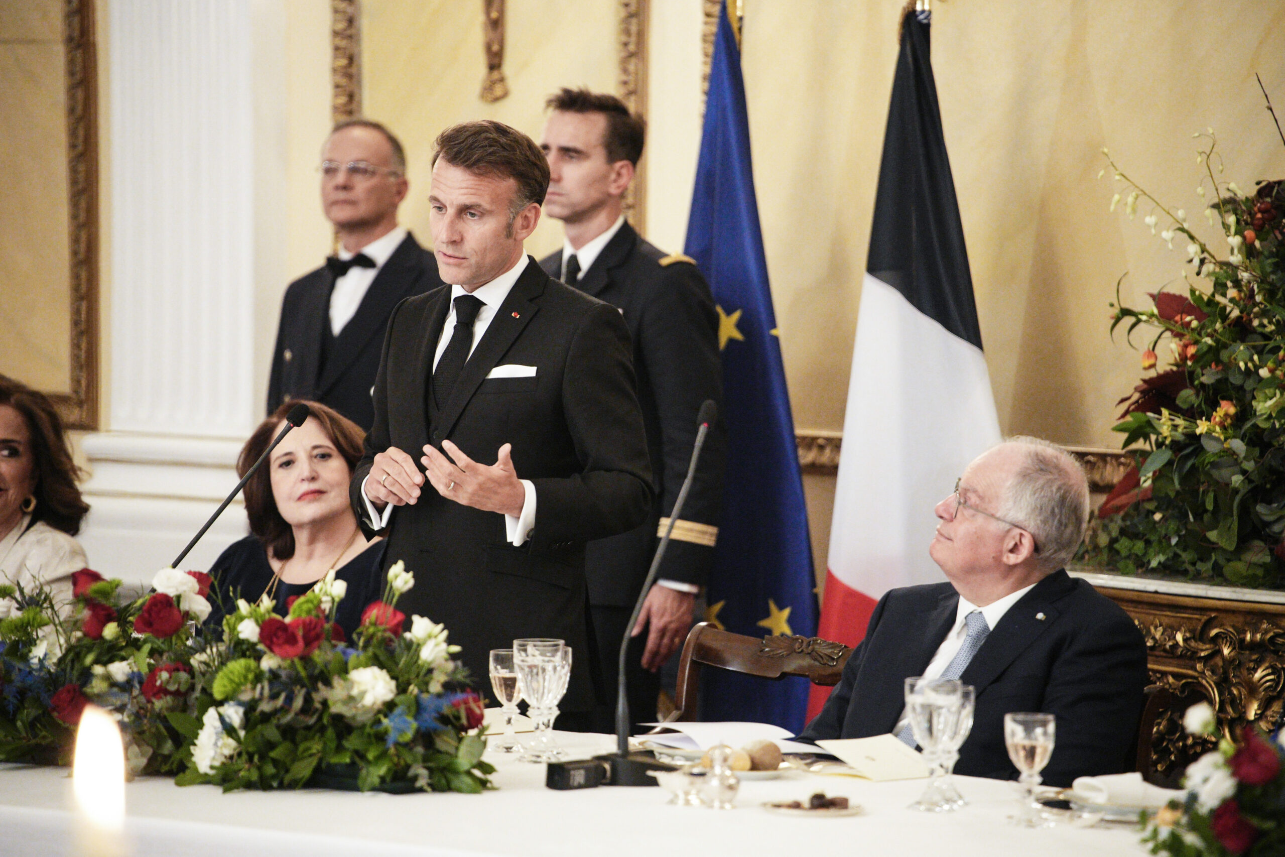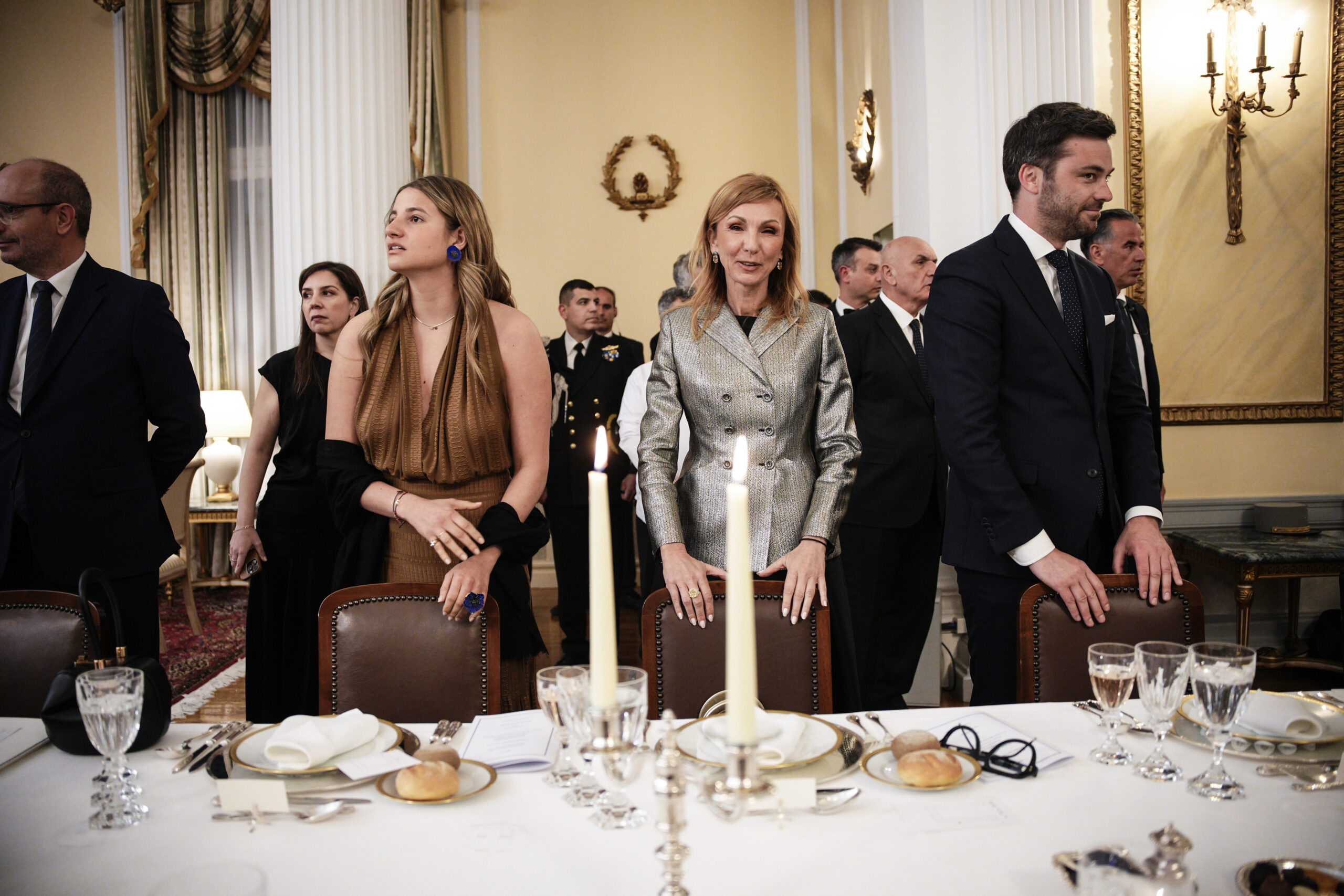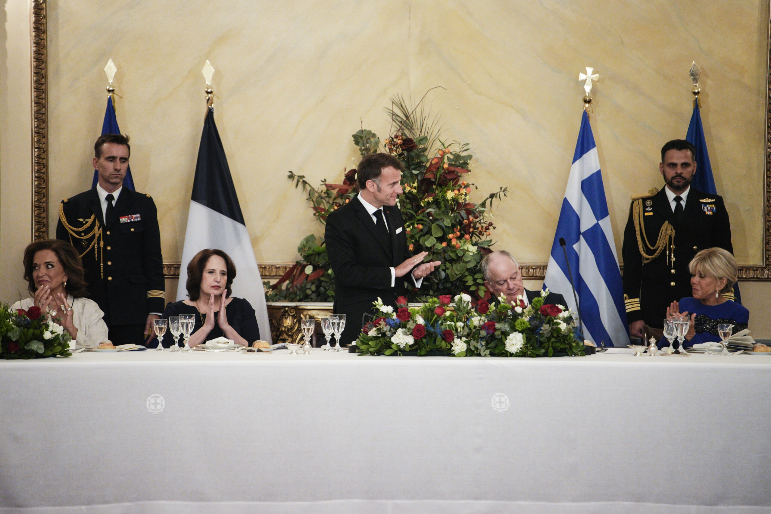 Ο Κωνσταντίνας Τασούλας και η σύζυγός του, Φανή Σταθοπούλου υποδέχτηκαν το ζεύγος Μακρόν στο Προεδρικό Μέγαρο για το επίσημο δείπνο.