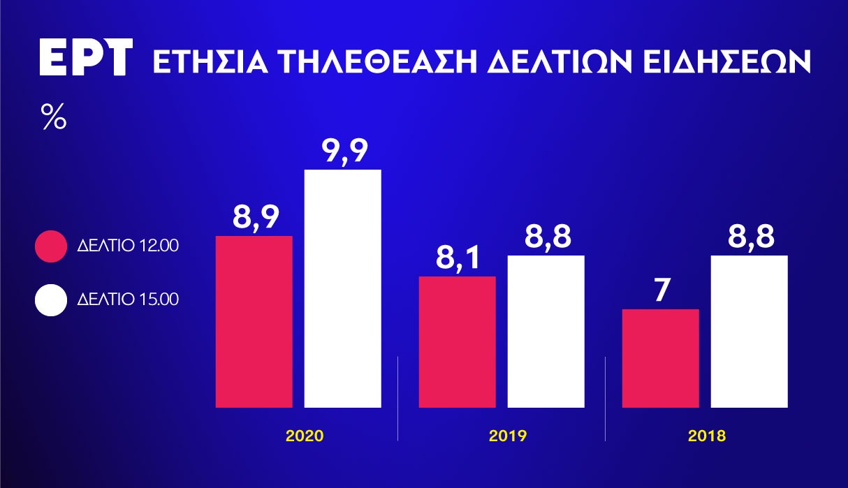 Ανάλογη ικανοποίηση, όμως, υπάρχει στο ενημερωτικό τμήμα της ΕΡΤ και για το κεντρικό δελτίο ειδήσεων το οποίο, αν και διαχρονικά μεταδίδεται στις 21:00 -δηλαδή μετά από όλα τα κεντρικά ειδήσεων των ιδιωτικών καναλιών- το 2020 κατέγραψε μέση τηλεθέαση 6,1%. Ποσοστό που μεταφράζεται ημερησίως σε 239.758 τηλεθεατές -αριθμός επίσης ρεκόρ- και για πρώτη φορά κατατάσσει τη δημόσια τηλεόραση στην 5η θέση τηλεθέασης ανάμεσα στα 7 κανάλια πανελλαδικής εμβέλειας.