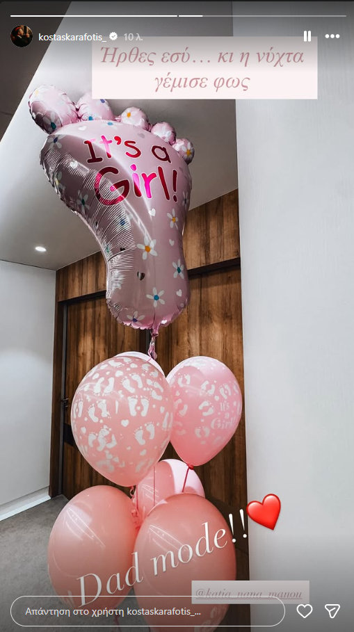 Την ευχάριστη είδηση ανακοίνωσε στα social media το πρωί της Τετάρτης 28 Ιανουαρίου ο τραγουδιστής, δημοσιεύοντας φωτογραφία με τα ροζ μπαλόνια στο μαιευτήριο.
