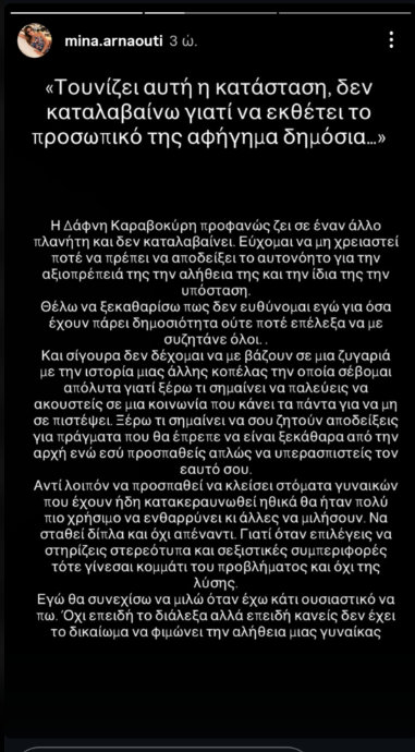 Η Μίνα Αρναούτη με ανάρτησή της στο instagram απαντά στις δηλώσεις που έκανε η Δάφνη Καραβουκύρη στην εκπομπή Real View, μετά την συνέντευξή της στον Γιώργο Λιάγκα.