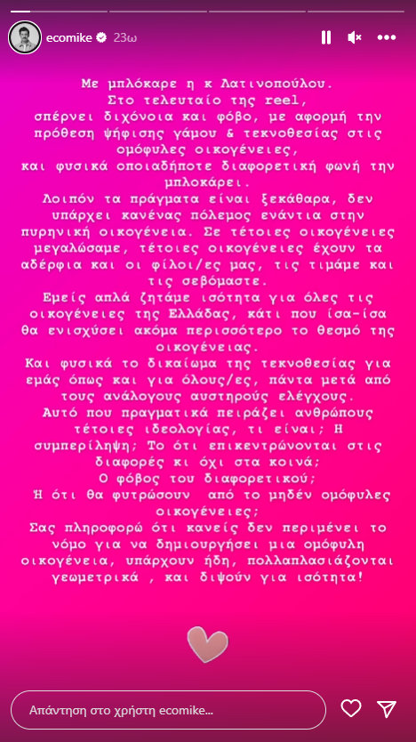 «Με μπλόκαρε η κ. Λατινοπούλου. Στο τελευταίο της real (βίντεο στο instagram) σπέρνει διχόνοια και φόβο, με αφορμή την πρόθεση ψήφισης γάμου και τεκνοθεσίας στις ομόφυλες οικογένειες και φυσικά οποιαδήποτε διαφορετική φωνή, την μπλοκάρει.
