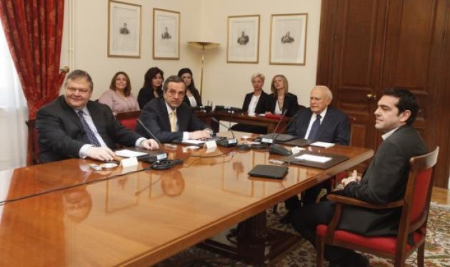Νωρίτερα σήμερα έγινε η σύσκεψη των τριών πολιτικών αρχηγών υπό τον Πρόεδρο της Δημοκρατίας Κ. Παπούλια η οποία διήρκησε περίπου μιάμιση ώρα και κατέληξε σε πλήρες αδιέξοδο. Κανείς τους δεν έκανε δηλώσεις βγαίνοντας από το Προεδρικό. Το μόνο που είπε ο Α.Σαμαράς, αρχικά, στους δημοσιογράφους είναι οτι η διαβούλευση συνεχίζεται.