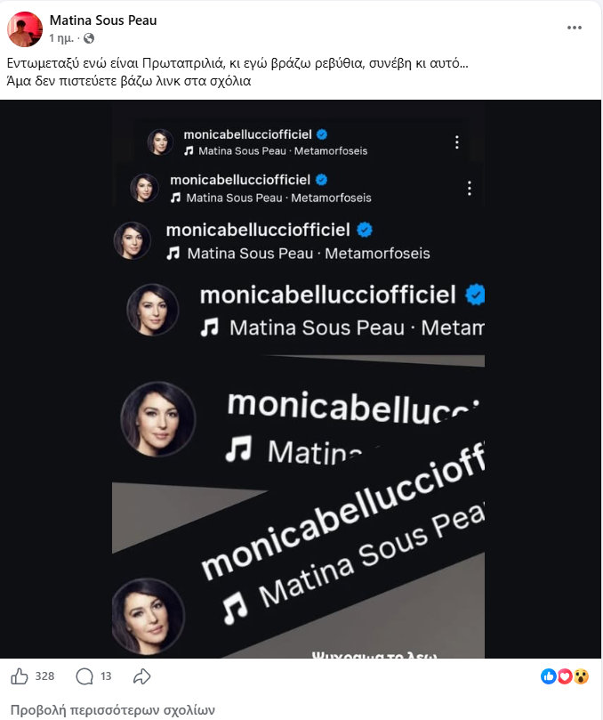H Matina Sous Peau βλέποντας την ανάρτηση της Μόνικα Μπελούτσι έγραψε στα social media: «Εντωμεταξύ ενώ είναι Πρωταπριλιά, κι εγώ βράζω ρεβύθια, συνέβη κι αυτό… Άμα δεν πιστεύετε βάζω λινκ στα σχόλια».
