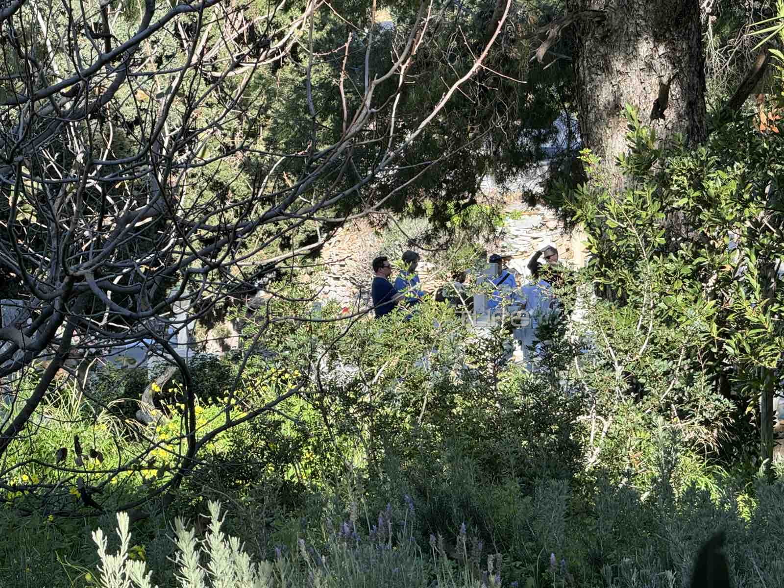 Στις νέες εικόνες που εξασφάλισε το TLIFE βλέπουμε τον σκηνοθέτη της ταινίας μαζί με μέλη της παραγωγής να πραγματοποιούν ρεπεράζ σε ένα από τα πιο ιδιαίτερα σημεία του νησιού -το νεκροταφείο Υδρίας – εξετάζοντας προσεκτικά τον χώρο και συζητώντας λεπτομέρειες για τη σκηνοθετική προσέγγιση των σκηνών.