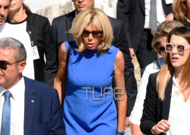Με ένα μπλε μίνι φόρεμα που αναδεικνύει τη λεπτή της φιγούρα αλλά και τις αγαπημένες της μαύρες εσπαντρίγιες που φόρεσε και χθες στον βράχο της Ακρόπολης, εμφανίστηκε το πρωί στην Αρχαία Αγορά η Μπριζίτ Τρονιέ. (Brigitte Trogneux). Tο look της συμπλήρωσε με μαύρα γυαλιά και μαύρη τσάντα του αγαπημένου της γαλλικού οίκου, Louis Vuitton