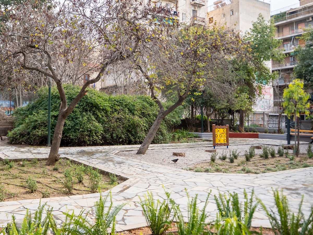 - Ένας σύγχρονος χώρος πρασίνου με αστικό εξοπλισμό, σύστημα άρδευσης και πλούσια φύτευση