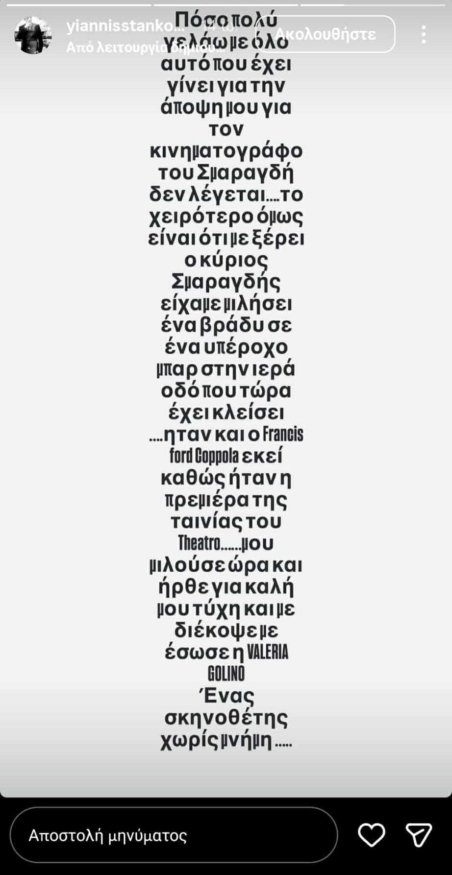«Πόσο πολύ γελάω με όλο αυτό που έχει γίνει για την άποψη μου για τον κινηματογράφο του Σμαραγδή δεν λέγεται…. το χειρότερο όμως είναι ότι με ξέρει ο κύριος Σμαραγδής είχαμε μιλήσει ένα βράδυ σε ένα υπέροχο μπαρ στην ιερά οδό που τώρα έχει κλείσει ….ήταν και ο Francis ford Coppola εκεί καθώς ήταν η πρεμιέρα της ταινίας του Theatro…..μου μιλούσε ώρα και ήρθε για καλή μου τύχη και με διέκοψε με έσωσε η VALERIA GOLINO. Ένας σκηνοθέτης χωρίς μνήμη…..» έγραψε χαρακτηριστικά ο Γιάννης Στάνκογλου.