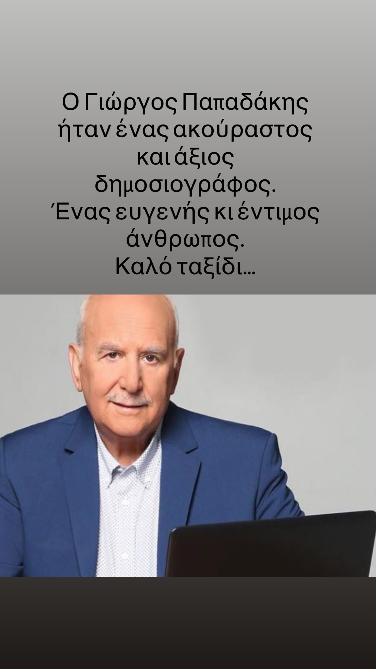 «Ο Γιώργος Παπαδάκης ήταν ένας ακούραστος και άξιος δημοσιογράφος. Ένας ευγενής και έντιμος άνθρωπος. Καλό ταξίδι» έγραψε ο Γιώργος Νταλάρας στην ανάρτησή του.