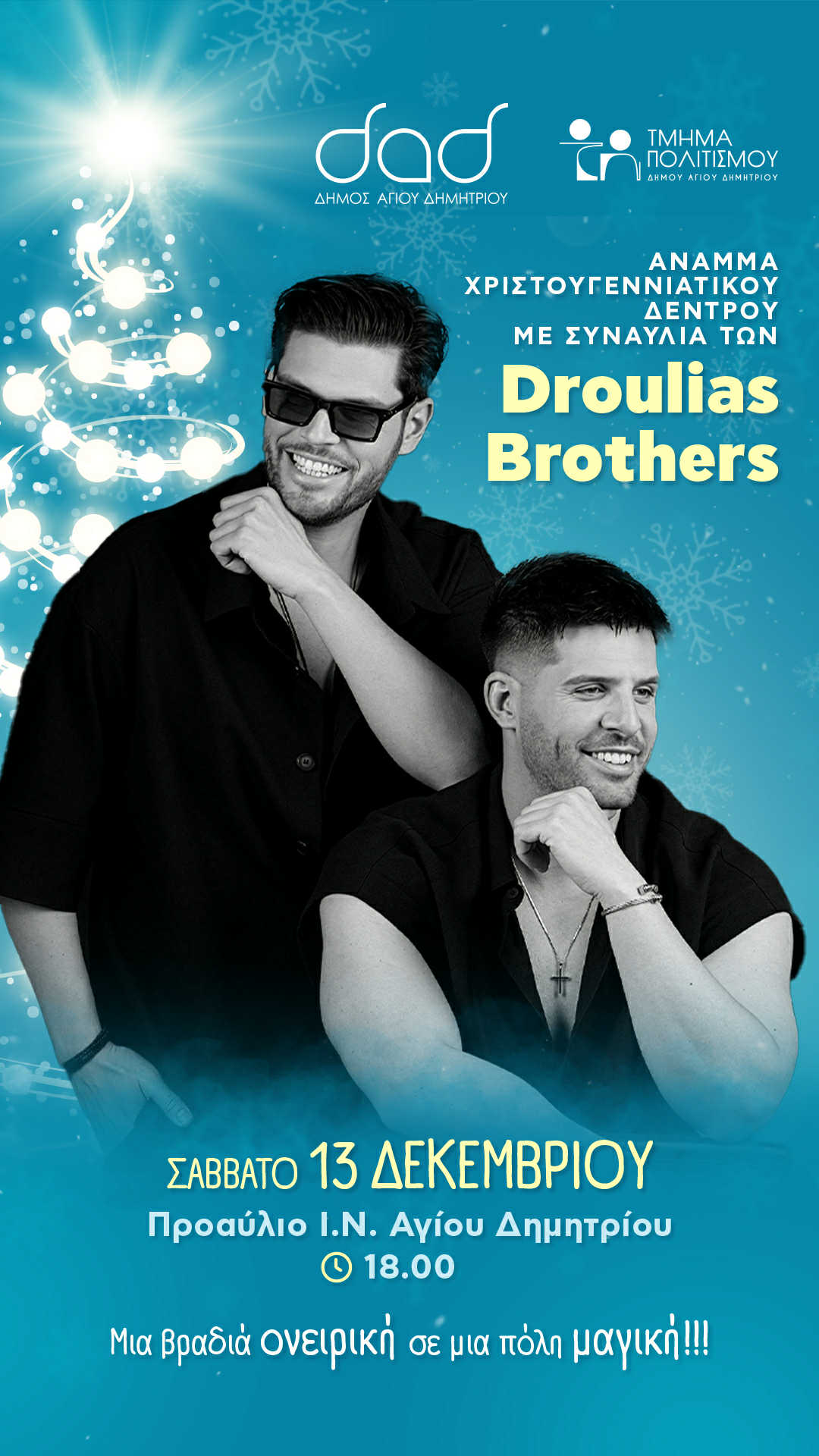 Τη δυσαρέσκεια και την αγανάκτησή του μετά την αιφνίδια ακύρωση της προγραμματισμένης εμφάνισής των Droulias Brothers στη φωταγώγηση του χριστουγεννιάτικου δέντρου του Δήμου Αγίου Δημητρίου, εξέφρασε ο Κωνσταντίνος Δρούλιας μιλώντας στο TLIFE.