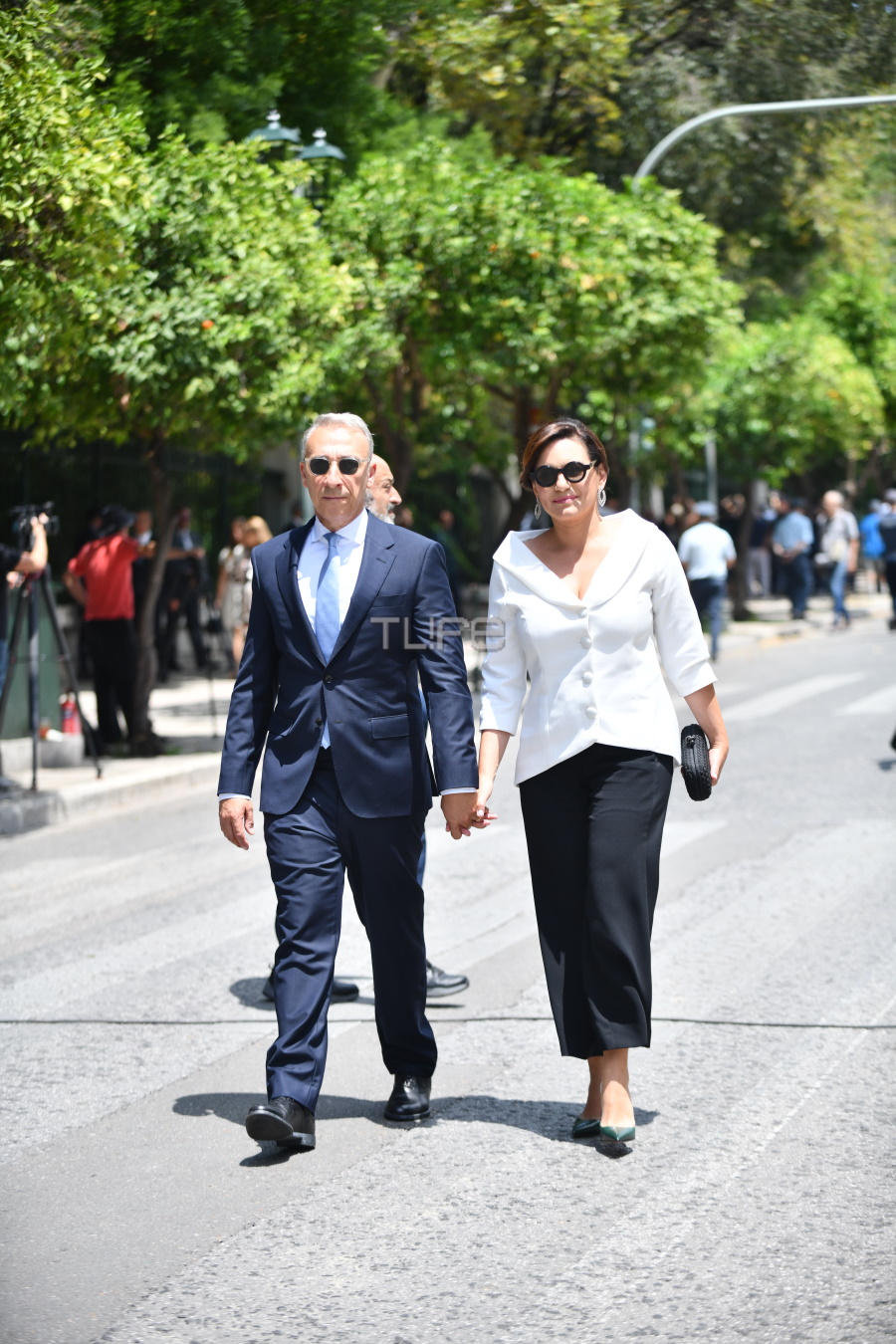 Η Όλγα Κεφαλογιάννη έφτασε λίγη ώρα πριν την ορκωμοσία, συνοδευόμενη από τον σύζυγό της και καταξιωμένο μουσικοσυνθέτη, Μίνω Μάτσα.
