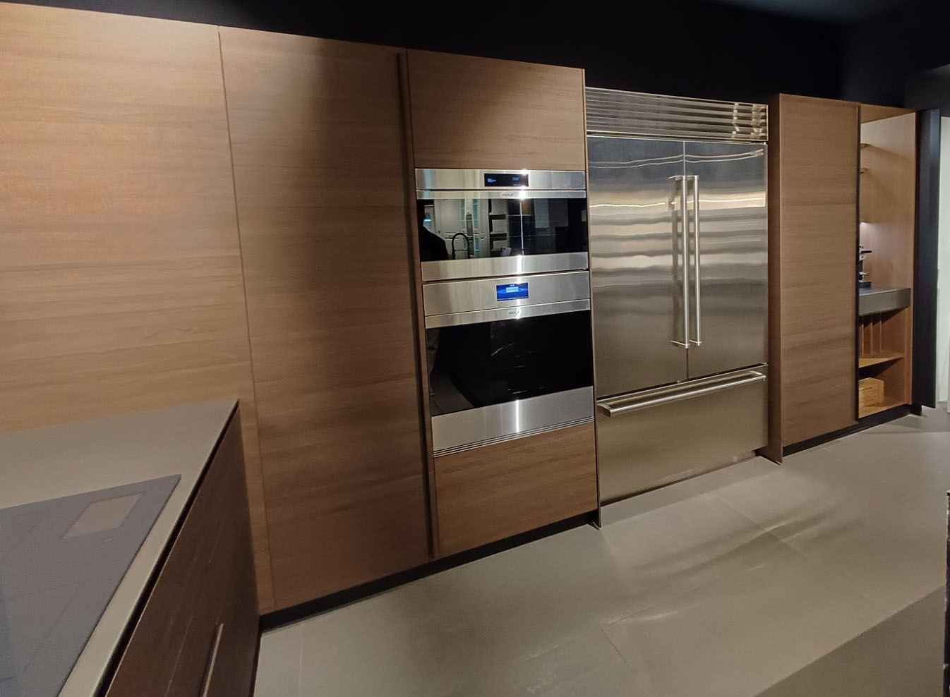 Στο πίσω τμήμα της κουζίνας, η New Logica λειτουργεί ως ένα έξυπνο, δυναμικό σύστημα που αποκαλύπτεται μόνο όταν το χρειάζεσαι. Οι επάνω ανακλινόμενες και οι κάτω συρόμενες πόρτες κινούνται αθόρυβα και απαλά, σαν να αιωρούνται.