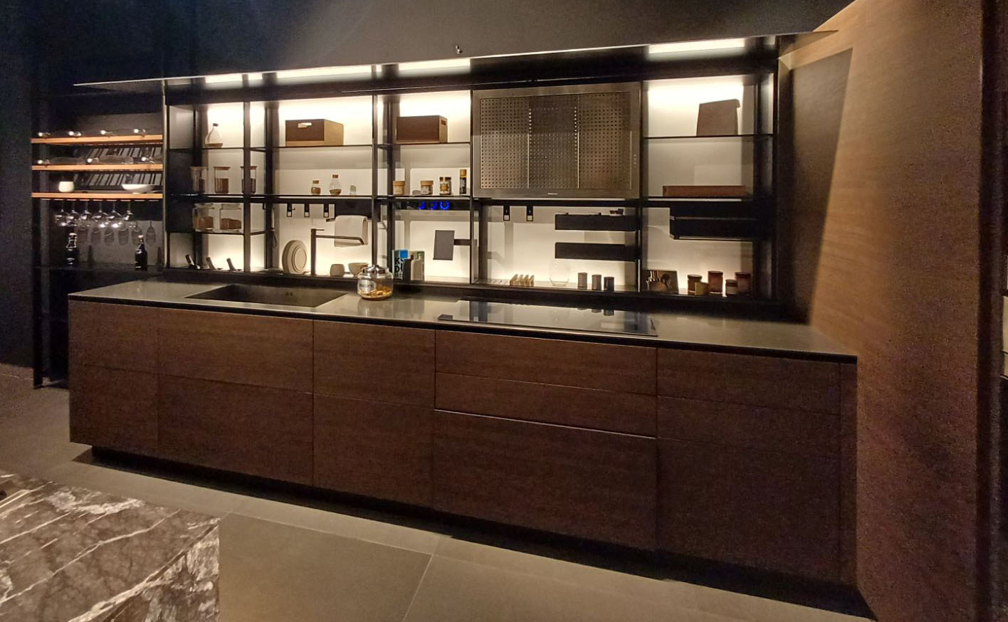 Το πατενταρισμένο αυτό σύστημα μπορεί να διαμορφωθεί σύμφωνα με τις ανάγκες σου και να φιλοξενήσει ακόμη και απορροφητήρα. Το φωτεινό πάνελ ενισχύει την αίσθηση ελαφρότητας και τάξης, προσφέροντας μια αυστηρή αλλά ταυτόχρονα φιλόξενη αισθητική καθαρότητα.