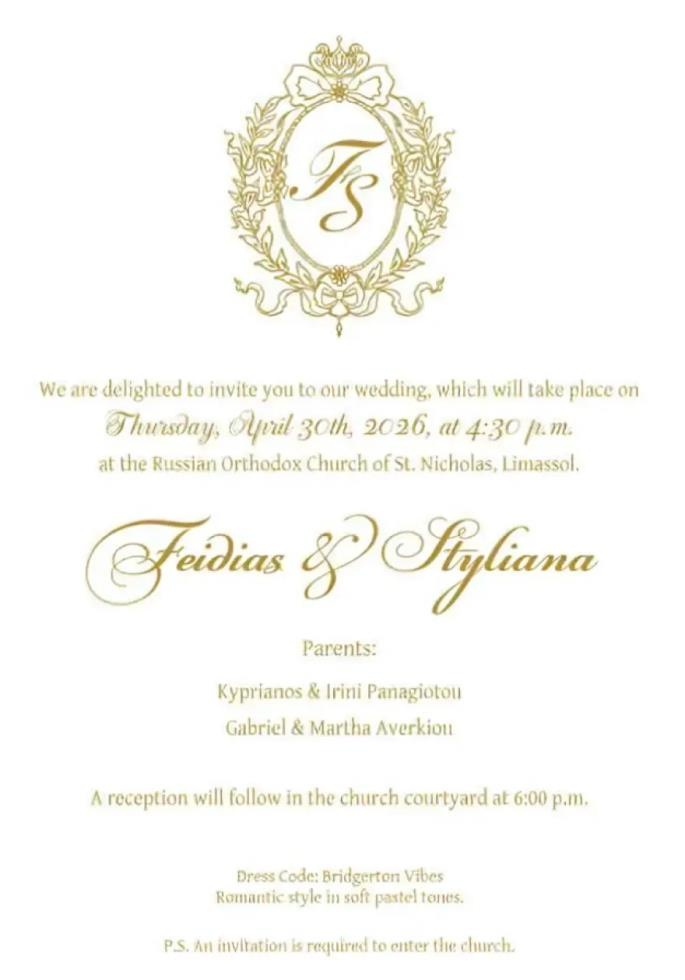 Όπως αναφέρεται στο προσκλητήριο, το ζευγάρι έχει ορίσει ως dress code «Bridgerton vibes», με ρομαντικό ύφος σε απαλές παστέλ αποχρώσεις. Παράλληλα σημειώνεται, ότι οι καλεσμένοι θα πρέπει να δείξουν το προσκλητήριό τους στην είσοδο της εκκλησίας.
