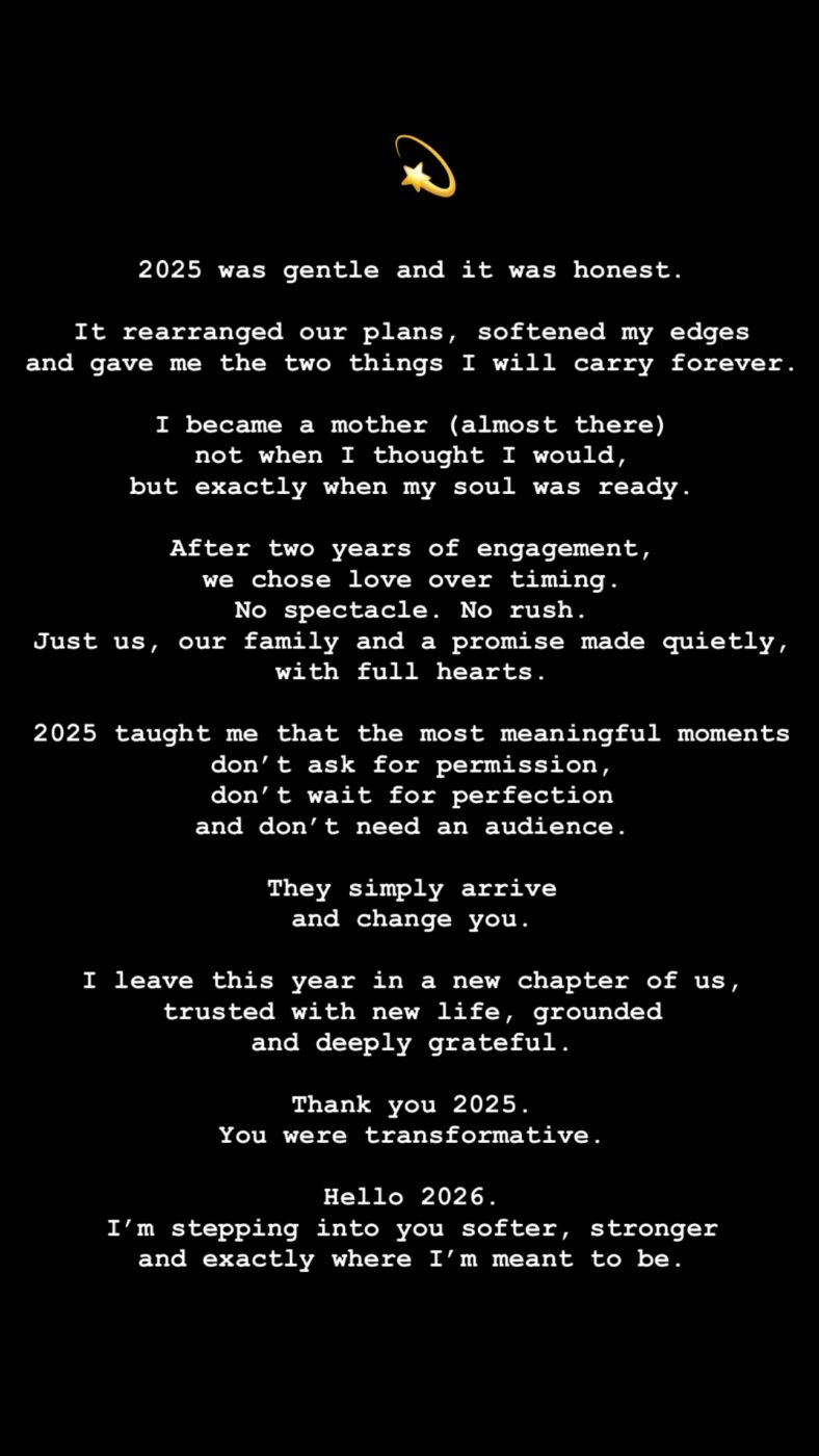 «Το 2025 ήταν τρυφερό και ειλικρινές. Αναδιάταξε τα σχέδιά μας, απάλυνε τις γωνίες μου και μου χάρισε τα δύο πράγματα που θα κουβαλώ για πάντα. Έγινα μητέρα (σχεδόν εκεί), όχι όταν νόμιζα ότι θα γινόταν, αλλά ακριβώς όταν η ψυχή μου ήταν έτοιμη.