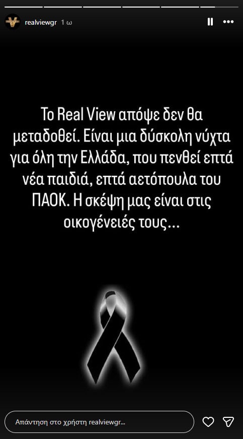 «Το Real View απόψε δεν θα μεταδοθεί. Είναι μια δύσκολη νύχτα για όλη την Ελλάδα, που πενθεί επτά νέα παιδιά, επτά αετόπουλα του ΠΑΟΚ.Η σκέψη μας είναι στις οικογένειές τους», ανέφερε η ανακοίνωση της εκπομπής.