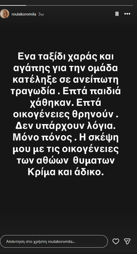 Το δικό της μήνυμα στις οικογένειες των θυμάτων της τραγωδίας έστειλε η Ρούλα Κορομηλά: «Ένα ταξίδι χαράς και αγάπης για την ομάδα κατέληξε σε ανείπωτη τραγωδία. Επτά παιδιά χάθηκαν. Επτά οικογένειες θρηνούν. Δεν υπάρχουν λόγια. Μόνο πόνος. Η σκέψη μου με τις οικογένειες των αθώων θυμάτων. Κρίμα κι άδικο», έγραψε στο instagram η παρουσιάστρια.