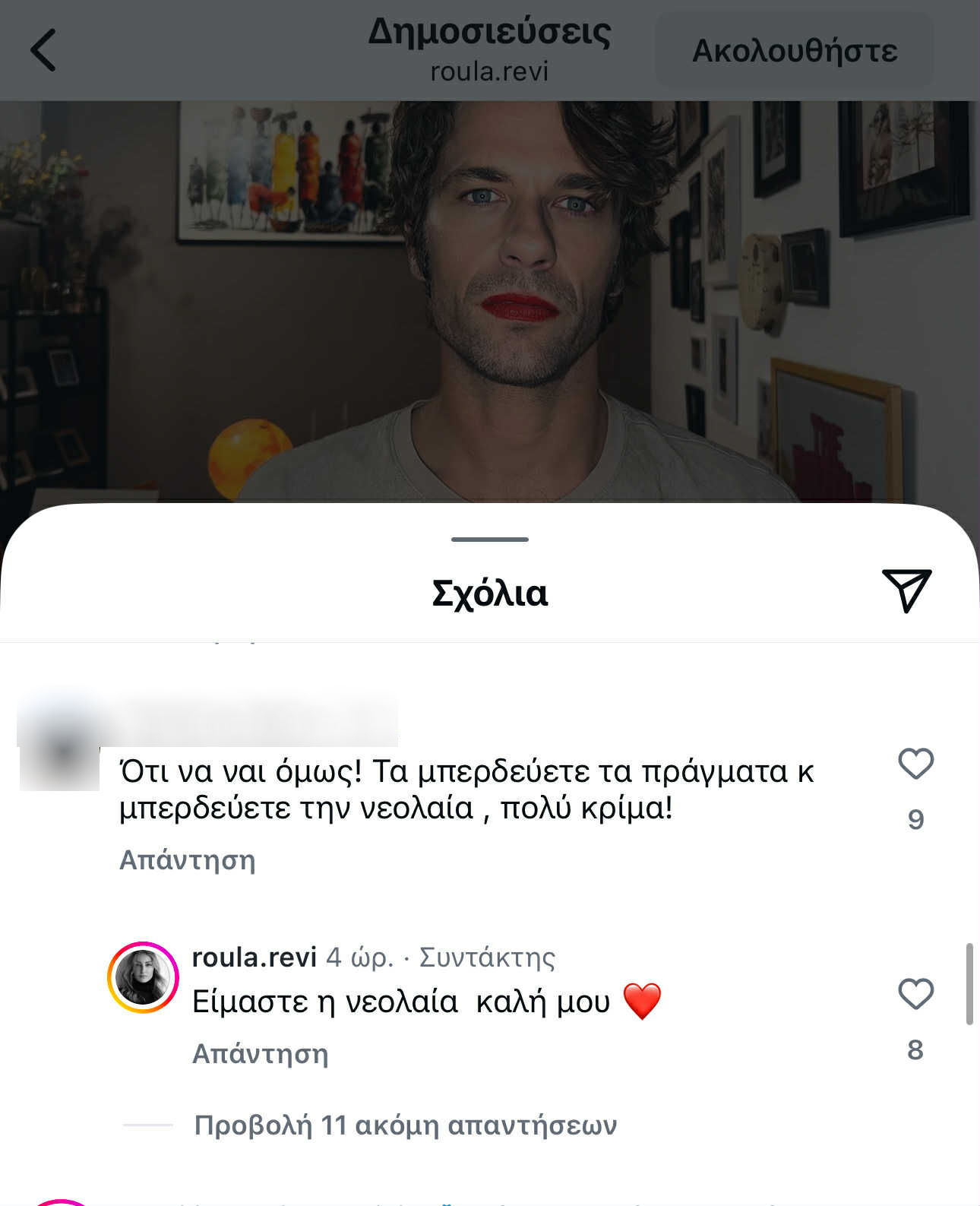 Κάτω από την ανάρτηση οι χρήστες του instagram σχολίασαν τη φωτογραφία του ηθοποιού. Ανάμεσα στα σχόλια, ένας λογαριασμός ανέφερε για την ανάρτηση: «Ο,τι να ‘ναι όμως! Τα μπερδεύετε τα πράγματα και μπερδεύετε τη νεολαία, πολύ κρίμα», με τη Ρούλα Ρέβη να απαντά: «Είμαστε η νεολαία καλή μου», έγραψε η φωτογράφος.