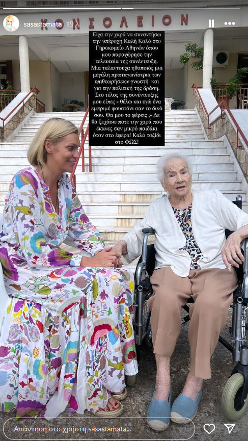 Στο τέλος της συνέντευξης μου είπε: “Θέλω και εγώ ένα εμπριμέ φουστάνι σαν το δικό σου. Θα μου το φέρεις; Δεν θα ξεχάσω ποτέ τη χαρά που έκανες σαν μικρό παιδάκι όταν στο έφερα! Καλό ταξίδι στο ΦΩΣ», έγραψε η Σάσα Σταμάτη για την Καλή Καλό.
