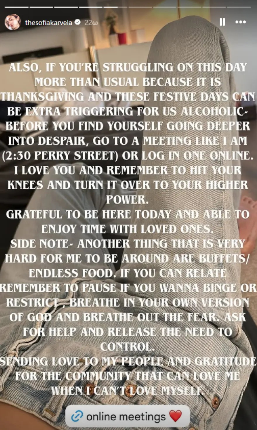 «Αν δυσκολεύεσαι αυτήν την ημέρα περισσότερο από το συνηθισμένο επειδή είναι Ημέρα των Ευχαριστιών και αυτές οι γιορτινές μέρες μπορεί να είναι ιδιαίτερα δύσκολες για εμάς τους αλκοολικούς, πριν βρεθείς να βυθίζεσαι ακόμη πιο βαθιά στην απόγνωση, πήγαινε σε μια συνάντηση όπως πηγαίνω κι εγώ ή μπες σε μία διαδικτυακά», έγραψε στην αρχή η Σοφία Καρβέλα.