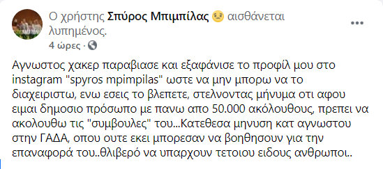 «Άγνωστος χάκερ παραβίασε και εξαφάνισε το προφίλ μου στο instagram “spyros mpimpilas” στέλνοντας μήνυμα ότι αφού είμαι δημόσιο πρόσωπο με πάνω από 50.000 ακόλουθους, πρέπει να ακολουθώ τις “συμβουλές” του…Kατέθεσα μήνυση κατ’ αγνώστου στη ΓΑΔΑ, όπου ούτε εκεί μπορέσαν να βοηθήσουν για την επαναφορά του.. Θλιβερό να υπάρχουν τέτοιου είδους άνθρωποι….».