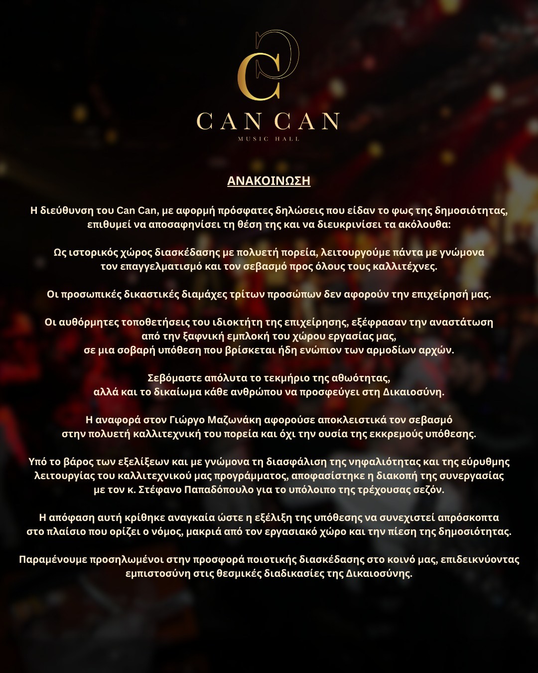 «Η διεύθυνση του Can Can, με αφορμή πρόσφατες δηλώσεις που είδαν το φως της δημοσιότητα, επιθυμεί να αποσαφηνίσει τη θέση της και να διευκρινίσει τα ακόλουθα: Ως ιστορικός χώρος διασκέδασης με πολυετή πορεία, λειτουργούμε πάντα με γνώμονα τον επαγγελματισμό και τον σεβασμό προς όλους τους καλλιτέχνες.