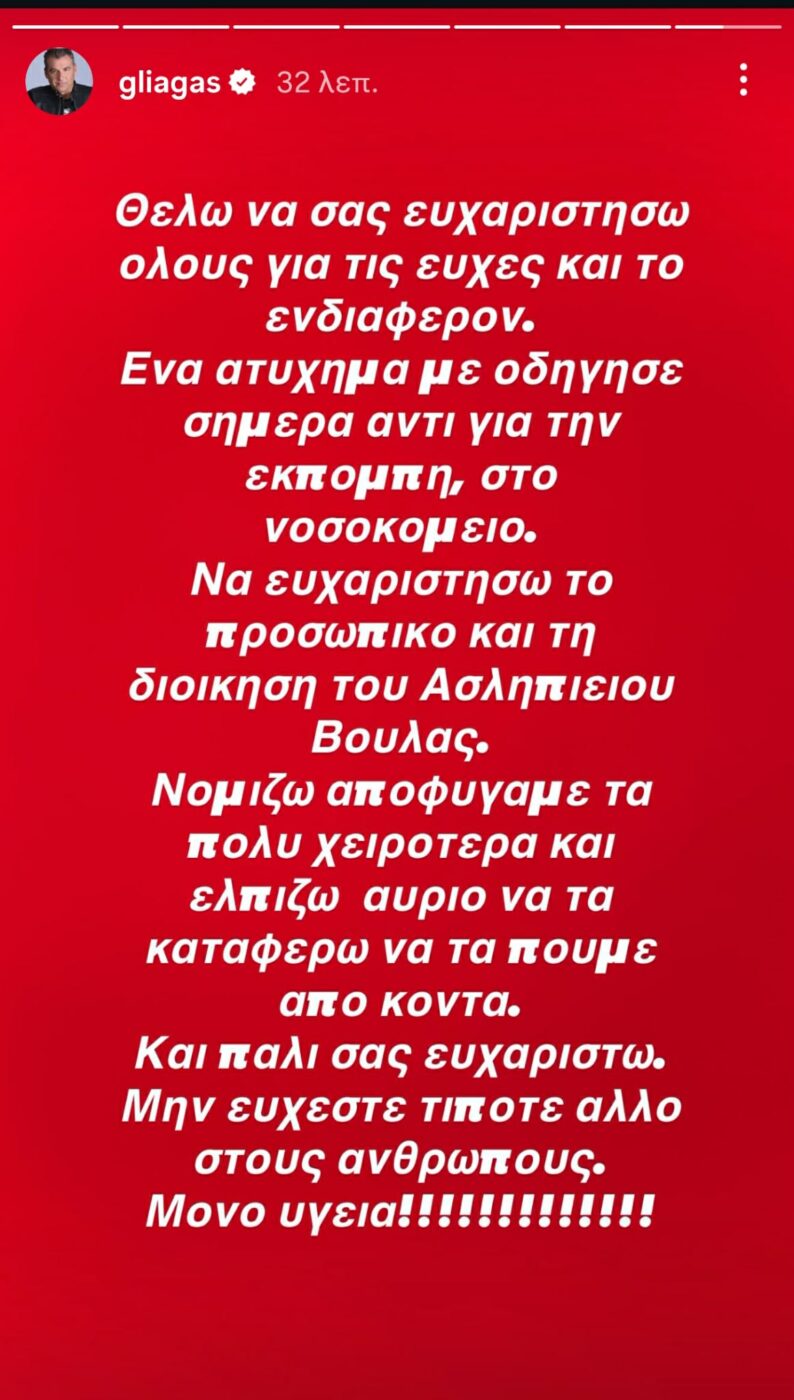 Πιο συγκεκριμένα, ο παρουσιαστής του ANT1 έγραψε στα Instagram Stories του πως: «Θέλω να σας ευχαριστήσω όλους για τις ευχές και το ενδιαφέρον. Ένα ατύχημα με οδήγησε σήμερα αντί για την εκπομπή στο νοσοκομείο. Να ευχαριστήσω το προσωπικό και τη διοίκηση του Ασκληπιού Βούλας. Νομίζω αποφύγαμε τα πολύ χειρότερα και ελπίζω αύριο να τα καταφέρω να τα πούμε από κοντά. Και πάλι σας ευχαριστώ. Μην εύχεστε τίποτα άλλο στους ανθρώπους. Μόνο υγεία!».