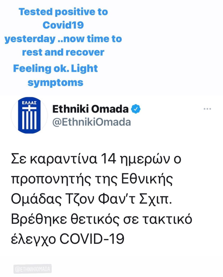 Σύμφωνα με την ενημέρωση από την ΕΠΟ (Ελληνική Ποδοσφαιρική Ομοσπονδία), ο Ολλανδός τεχνικός μπήκε σε καραντίνα 14 ημερών, ενώ μέσω του προσωπικού του λογαριασμού στο Instagram δημοσίευσε την είδηση… στα ελληνικά. Μάλιστα, σχολίασε: «Βρέθηκα θετικός στον Covid-19 χθες… Τώρα είναι ώρα να ξεκουραστώ και να αναρρώσω. Αισθάνομαι καλά. Έχω ήπια συμπτώματα».