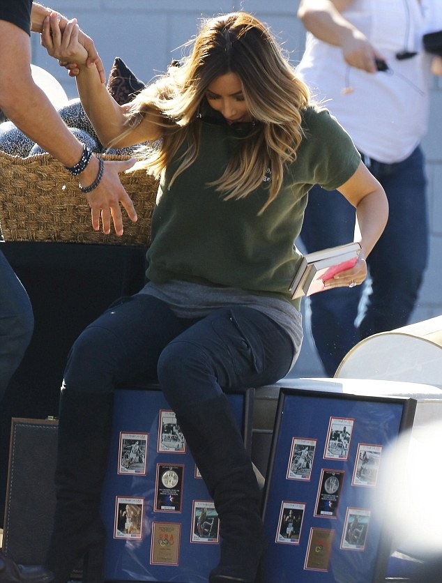 Ευτυχώς κοντά της ήταν ένας καλός της φίλος που προσπάθησε να την κρατήσει και έτσι η Kim προσγειώθηκε πάνω σε κάτι κουτιά. Όταν όμως σηκώθηκε και είδε στραμμένη πάνω της την κάμερα, έκρυψε το πρόσωπό της από ντροπή.