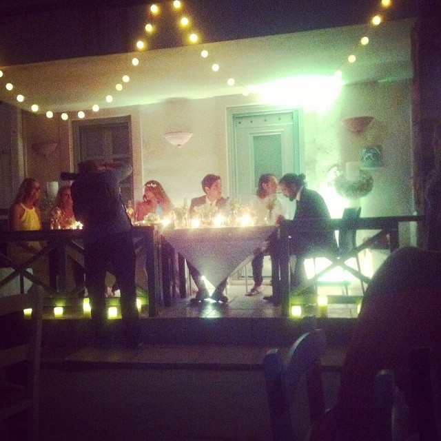 Η βραδιά κύλισε πολύ όμορφα, ενώ οι καλεσμένοι απόλαυσαν το γαμήλιο δείπνο ακούγοντας παλιά και νέα τραγούδια. Το μενού περιελάμβανε κυρίως θαλασσινά, με gourmet παραλλαγές σε γαρίδες και χταποδάκι και άφθονο κρασί.