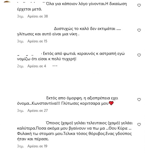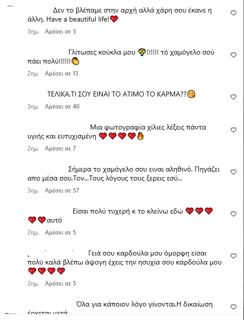 Η πρώην σύζυγος του Βασίλη Μπισμπίκη ανέβασε μια selfie φωτογραφία της πριν από τρεις μέρες στον λογαριασμό της στο instagram. Στην εν λόγω φωτογραφία, πολλοί ήταν εκείνοι που χωρίς να αναφέρουν το όνομα του ηθοποιού, έσπευσαν να σχολιάσουν γράφοντας ότι, «γλίτωσε» και πως, «το κάρμα μίλησε», με την ίδια να μη δίνει καμιά περεταίρω απάντηση στα σχόλια αυτά.