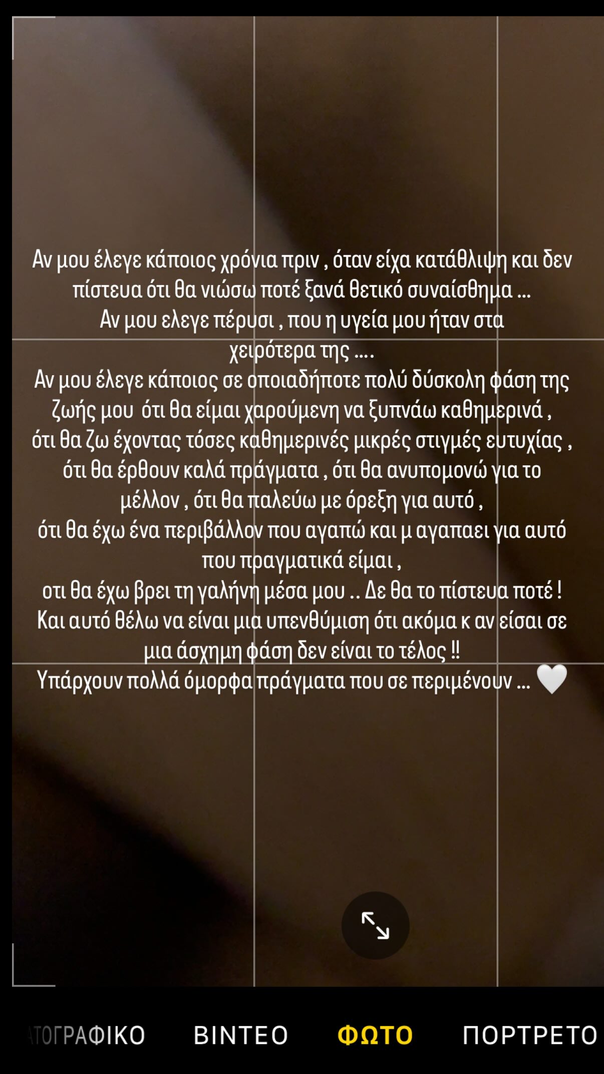 «Αν μου έλεγε κάποιος χρόνια πριν, όταν είχα κατάθλιψη και δεν πίστευα ότι θα νιώσω ποτέ ξανά θετικό συναίσθημα… Αν μου έλεγε πέρυσι, που η υγεία μου ήταν στα χειρότερα της…
