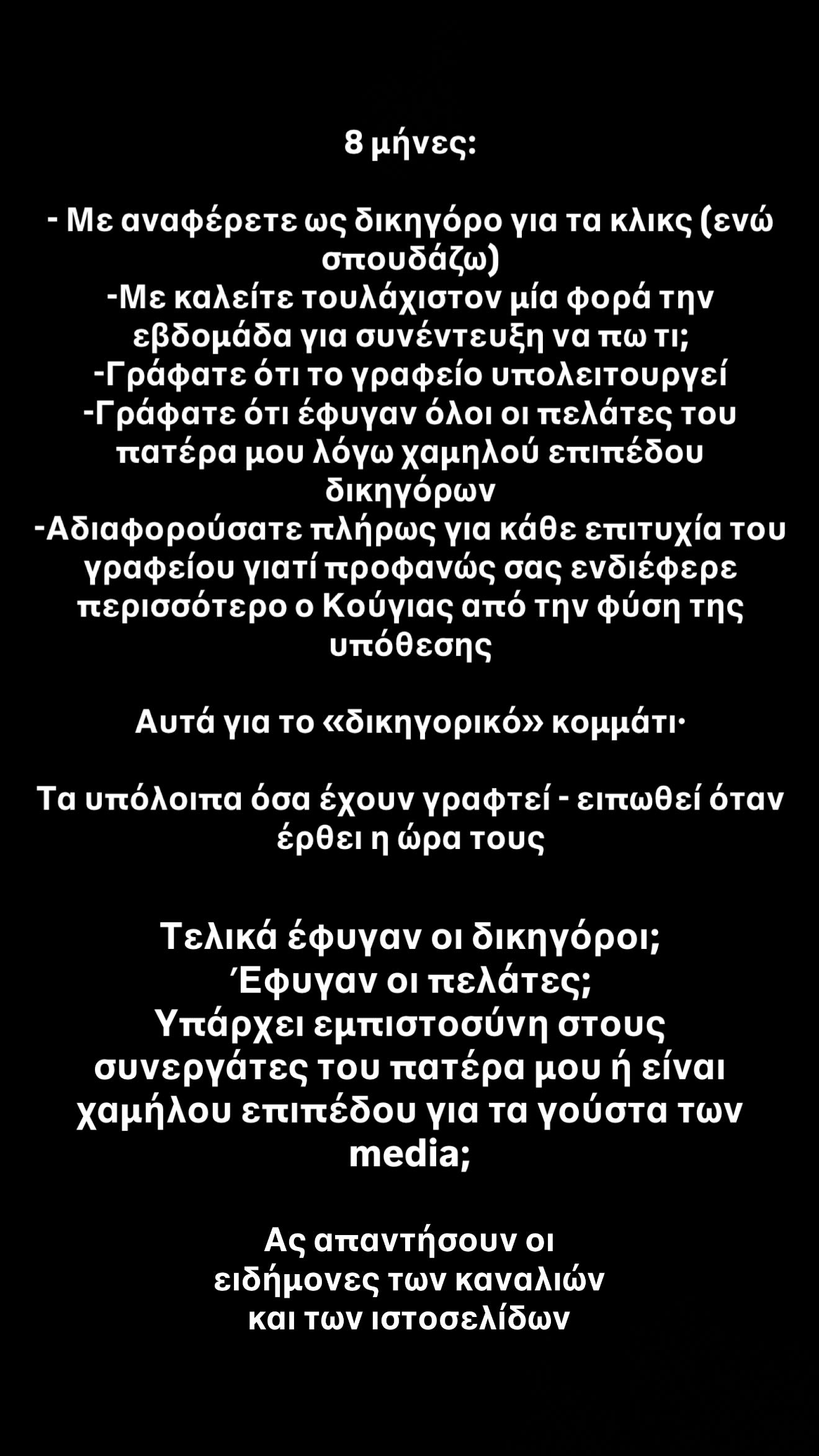 Τελικά έφυγαν οι δικηγόροι; Έφυγαν οι πελάτες; Υπάρχει εμπιστοσύνη στους συνεργάτες του πατέρα μου ή είναι χαμηλού επιπέδου για τα γούστα των media; Ας απαντήσουν οι ειδήμονες των καναλιών και των ιστοσελίδων», έγραψε στην ανάρτησή του ο Χρήστος Κούγιας.