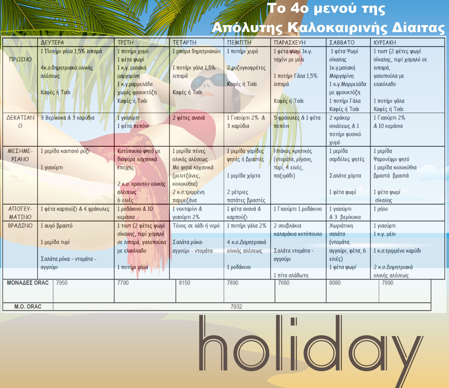 Η απόλυτη καλοκαιρινή δίαιτα είναι εκείνη που έχει αναλάβει να σε απαλλάξει από τα περιττά κιλά το καλοκαίρι. Προηγήθηκαν τα τρία μενού και σήμερα ακολουθεί το τέταρτο.