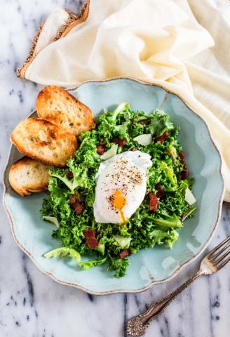 Πράσινη σαλάτα με ποσέ αυγό και μπέικον γαλοπούλας