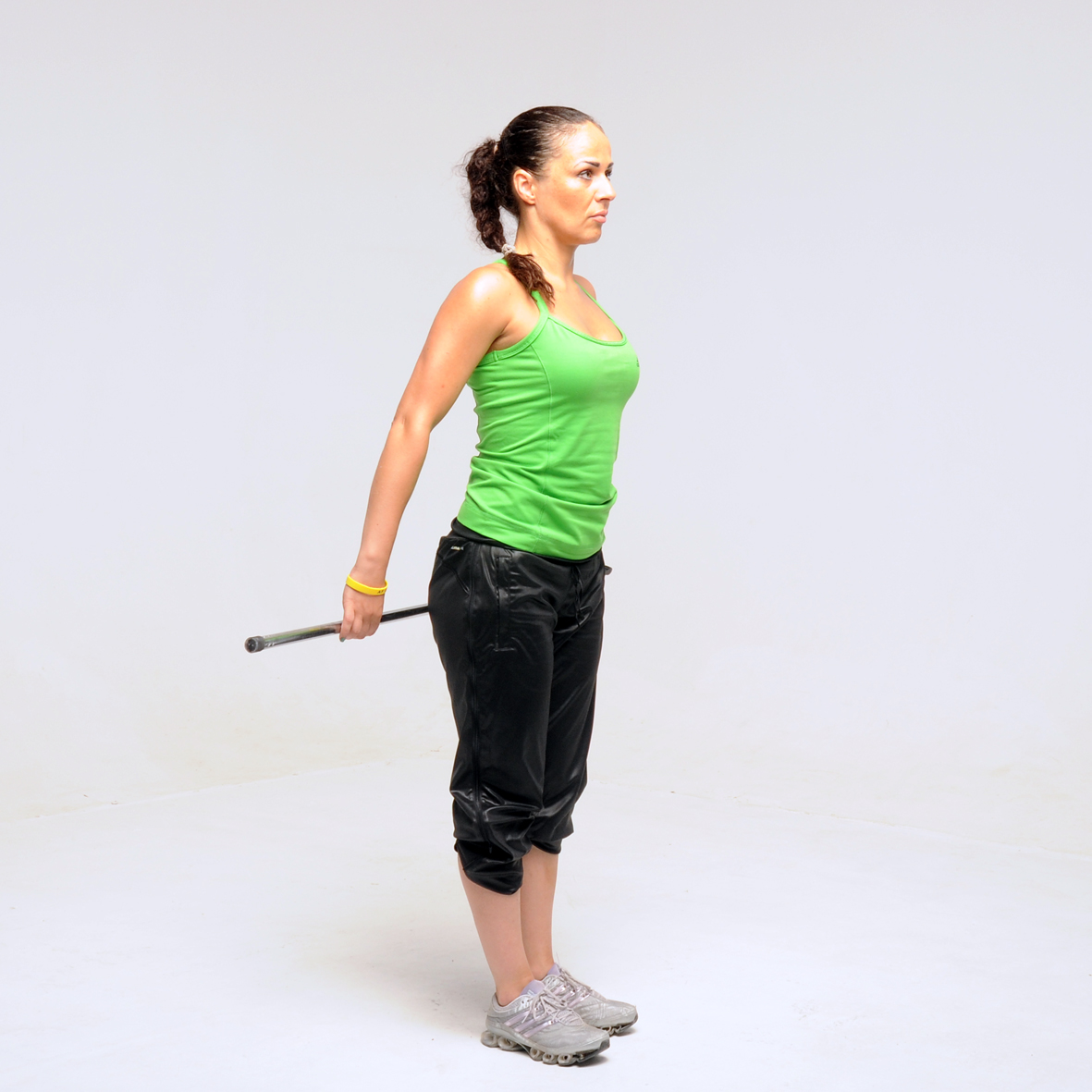 Από όρθια θέση κράτησε το σκουπόξυλο και με τα δύο σου χέρια τεντωμένα πίσω από την πλάτη και στο ύψος των γλουτών.