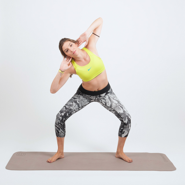 Λύγισε τα γόνατα, χωρίς να ξεπερνάνε τις μύτες των δαχτύλων, γύρε τον κορμό και προσπάθησε να φέρεις τον αγκώνα κοντά στο γόνατο. Έλα στην αρχική σου θέση και κάνε το ίδιο από την άλλη πλευρά. Κάνε 3 σετ των 8 επαναλήψεων.