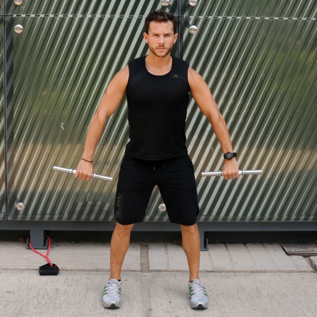Κράτησε τα βαράκια με τα χέρια τεντωμένα και σε ελαφριά έκταση, ενώ τα πόδια είναι σε διάσταση.