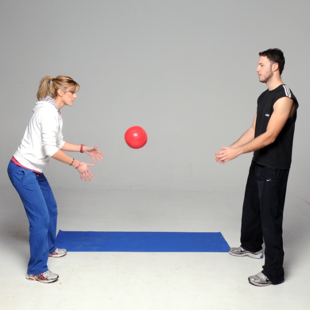 Πέταξε την μπάλα, τεντώνοντας τα χέρια ψηλά επάνω και μπροστά από το κεφάλι, διατηρώντας την στάση του σώματος σταθερή. Την ίδια κίνηση κάνει και ο σύντροφός σου που πιάνει την μπάλα. Επαναλάβετε 20 φορές την άσκηση.