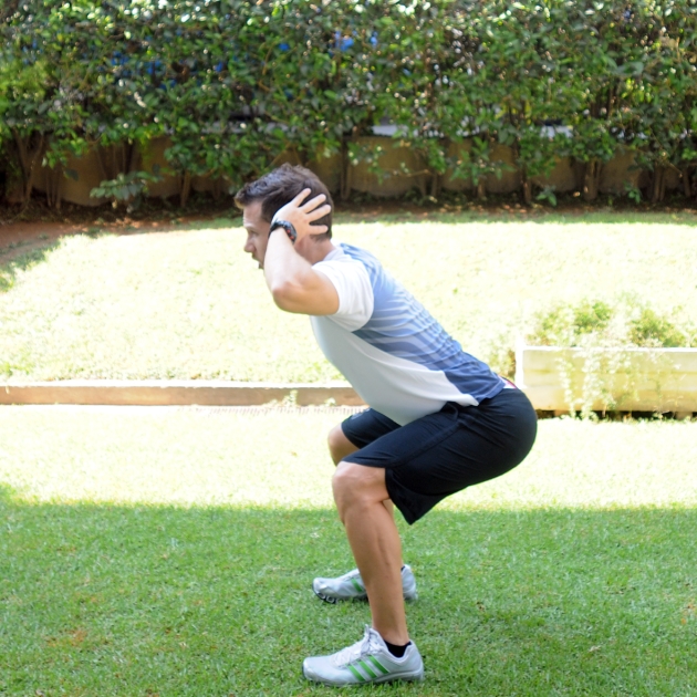 Φέρε τα χέρια πίσω από τον αυχένα με τα χέρια ανοικτά στην ευθεία των ώμων. Λύγισε τα γόνατα και χαμήλωσε όλο το σώμα χαμηλά, γέρνοντας ελαφρά όλο το σώμα προς τα εμπρός.