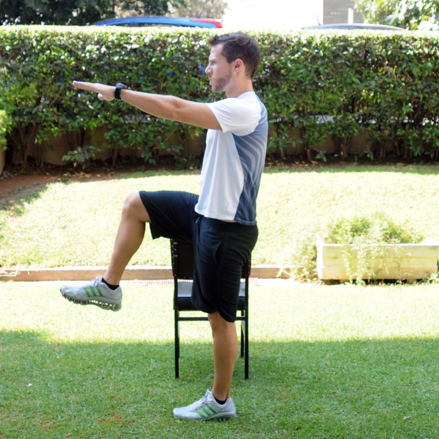 Χρησιμοποίησε την πλάτη μιας καρέκλας, ή κάποιο στήριγμα σε αντίστοιχο ύψος για να στηριχθείς. Από όρθια θέση φέρε αριστερό χέρι ψηλά τεντωμένο στην ευθεία των ώμων. Παράλληλα σήκωσε το δεξί γόνατο ψηλά, έτσι που ο μηρός να βρίσκετα στην ευθεία με την λεκάνη και παράλληλα με το έδαφος. Το γόνατο είναι λυγισμένο και η πλάτη σε ευθεία θέση.