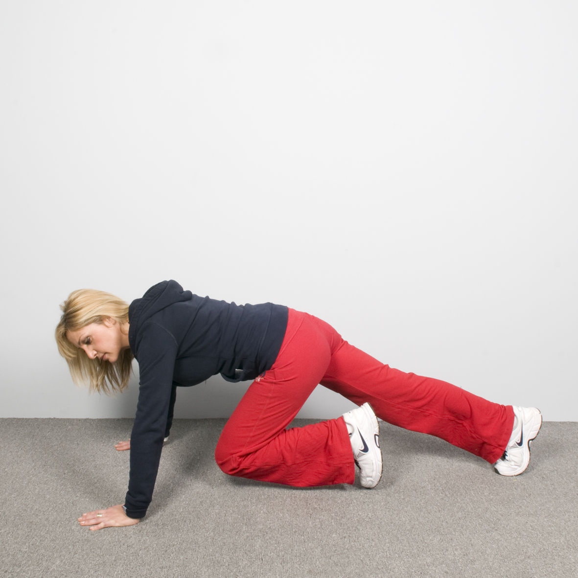 Aνασήκωσε το δεξί πόδι λυγίζοντας το γόνατο και κρατώντας τη θέση του μηρού σταθερή. Παράλληλα λύγισε ελαφρά τους αγκώνες χαμηλώνοντας σταδιακά τον κορμό