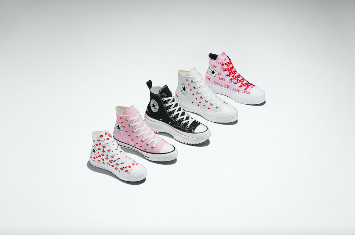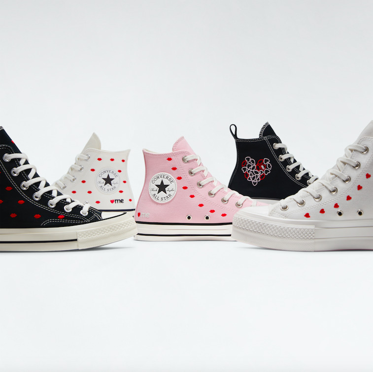 Τα limited edition Chuck 70, σε λευκό και μαύρο, συνδυάζουν την καθαρή φόρμα των Chuck Taylor και όλα τα στοιχεία που συνθέτουν το τέλειο Valentine’s day gift. Τα Run Star Hike αποκτούν ένα love–inspired update, με κεντημένες καρδιές που παραπέμπουν σε φιλιά και έντονες ροζ λεπτομέρειες. Η δίπατη σόλα διατηρεί την bold αισθητική και το χαρακτηριστικό chevron αστέρι του brand προσθέτει ένα cool twist στην θεματική της συλλογής. Τα All StarLift έχουν το “love me” embroidery, μικρές unexpected δόσεις χρώματος και lightweight επένδυση που τους επιτρέπει να είναι ελαφριά, χωρίς να χάνουν την chunky όψη τους. Τα classic All–Star Chucks βγαίνουν σε δύο χρώματα, μαύρο και baby pink με διάσπαρτες κόκκινες καρδιές.